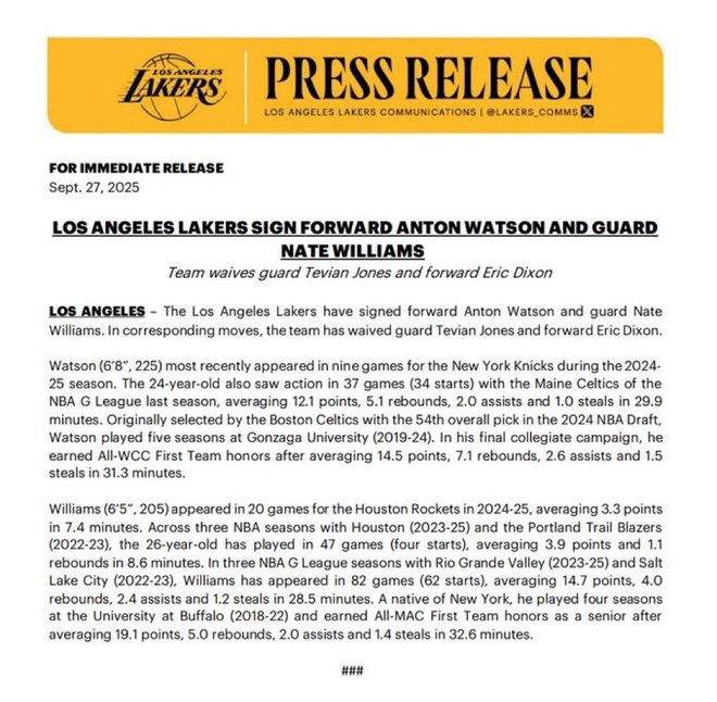 北京时间9月28日,湖人官方宣布,球队签下前锋安东-沃森与后卫内特-威廉姆斯,同时裁掉后卫特维安-琼斯与前锋埃里克-迪克森。以下是两位新签约球员的介绍——