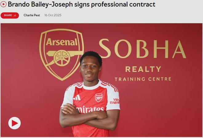 官方:阿森纳宣布和布兰多·拜利-约瑟夫签下了他的首份职业合同。